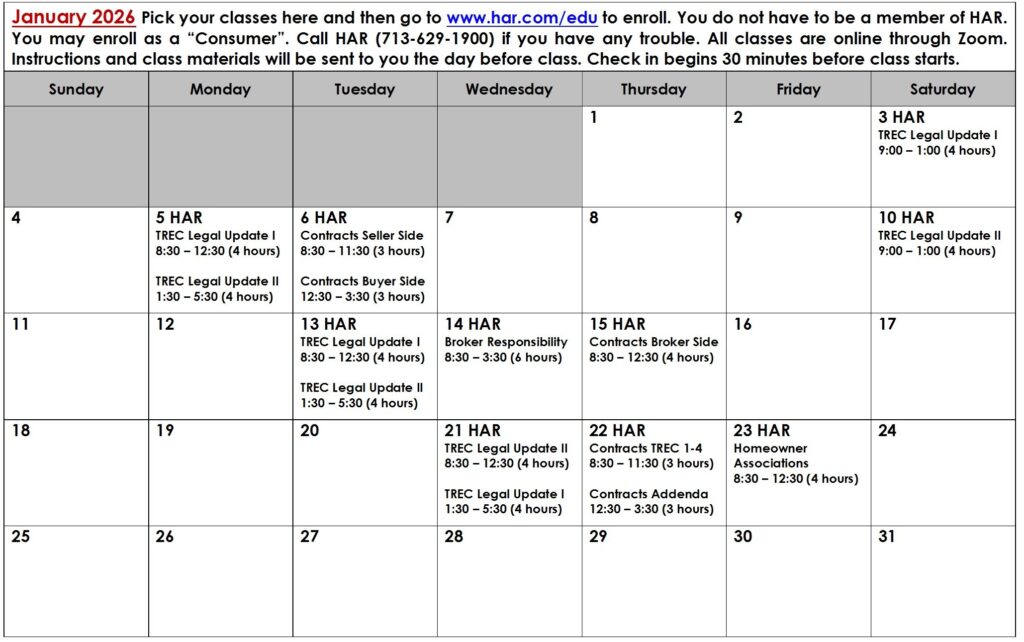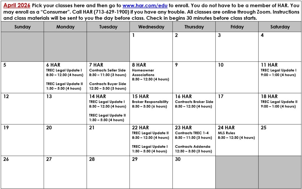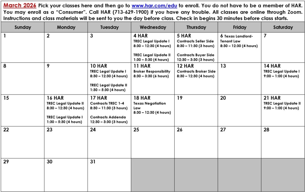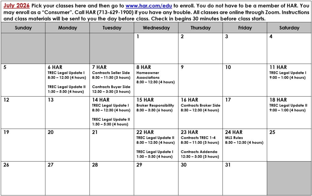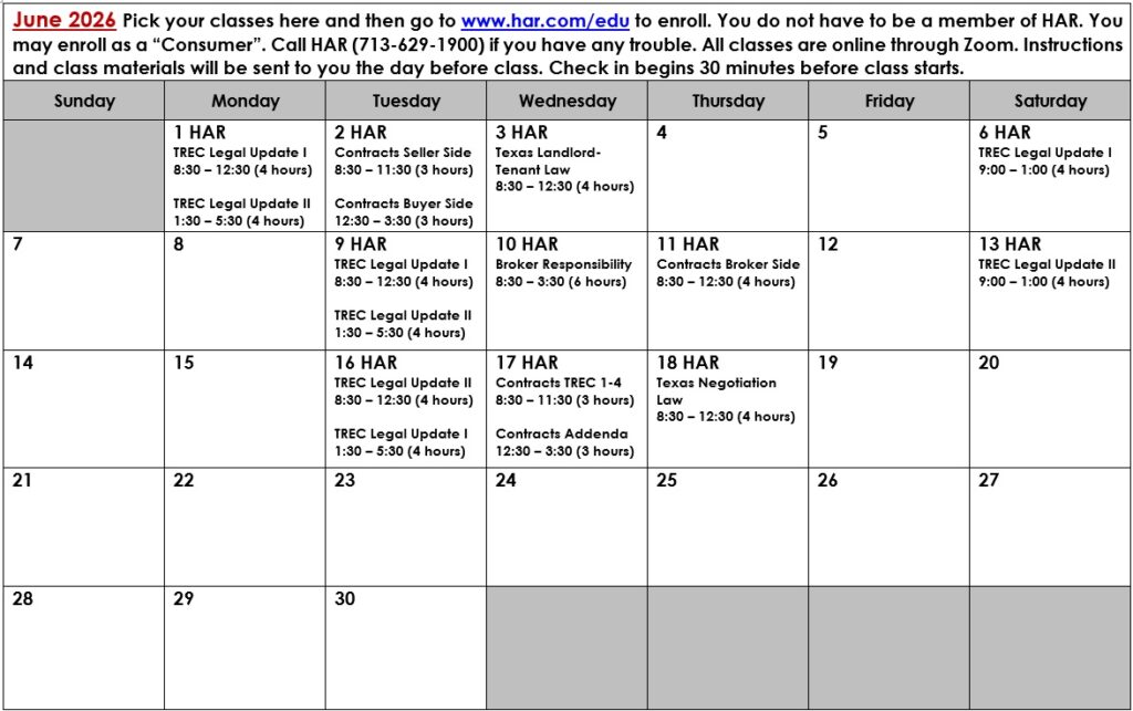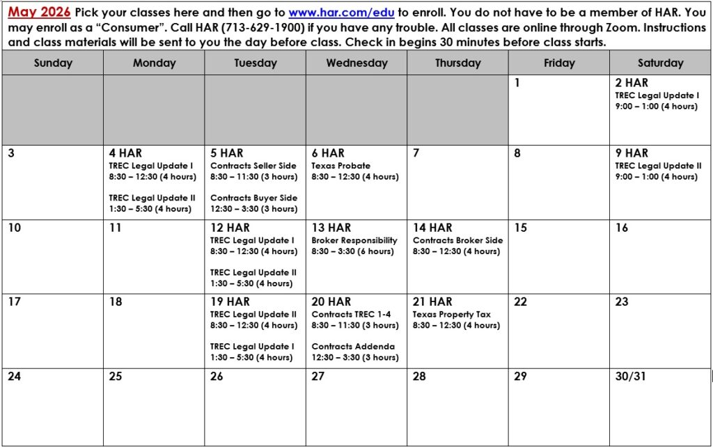 Scroll Down To See Course Calendars or Print the Brochure Classes are offered by the Houston Association of Realtors (CE Provider #2) and by Lloyd Hampton Real Estate Education (CE Provider #9844).